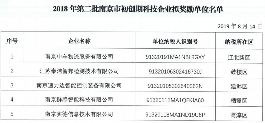 2018年第二批南京市初創(chuàng)期科技企業(yè)擬獎勵單位名單公示?